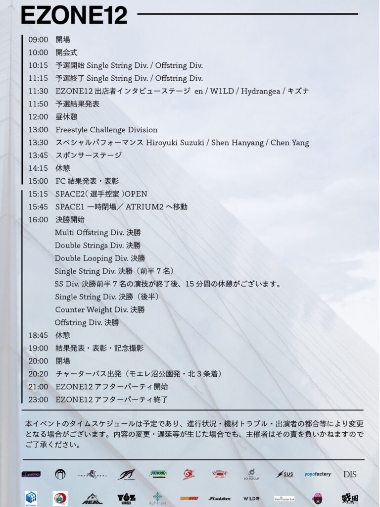 - 観戦時にヨーヨーなどが飛んで来たり、場内でプレイ中のヨーヨーにぶつかって怪我をする可能性もございます。いかなる場合におきましても、EZONEは一切の責任を負いかねますので、ご了承ください。